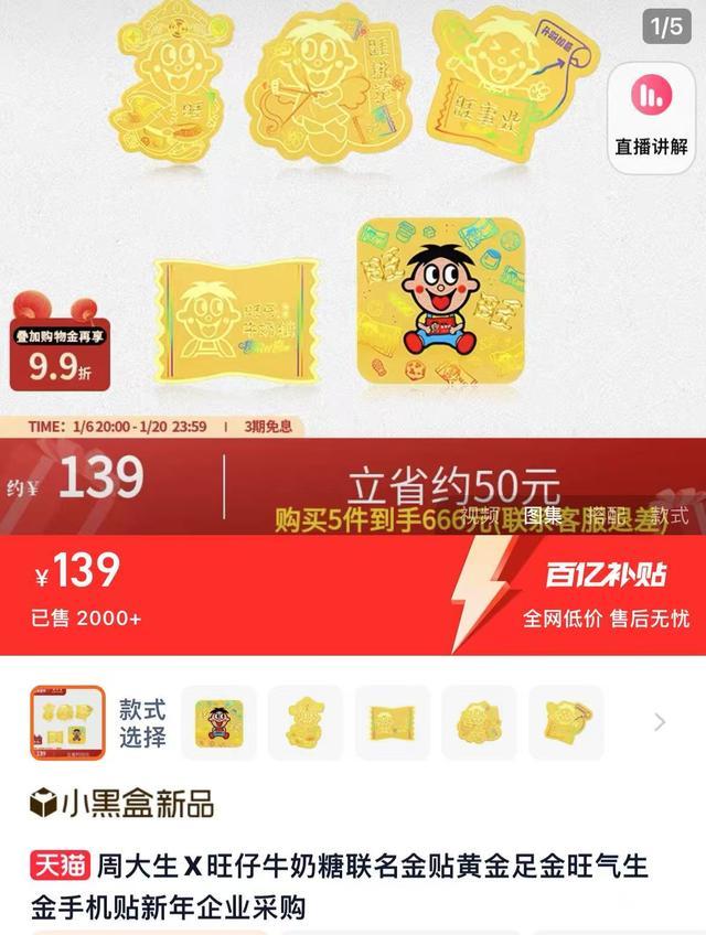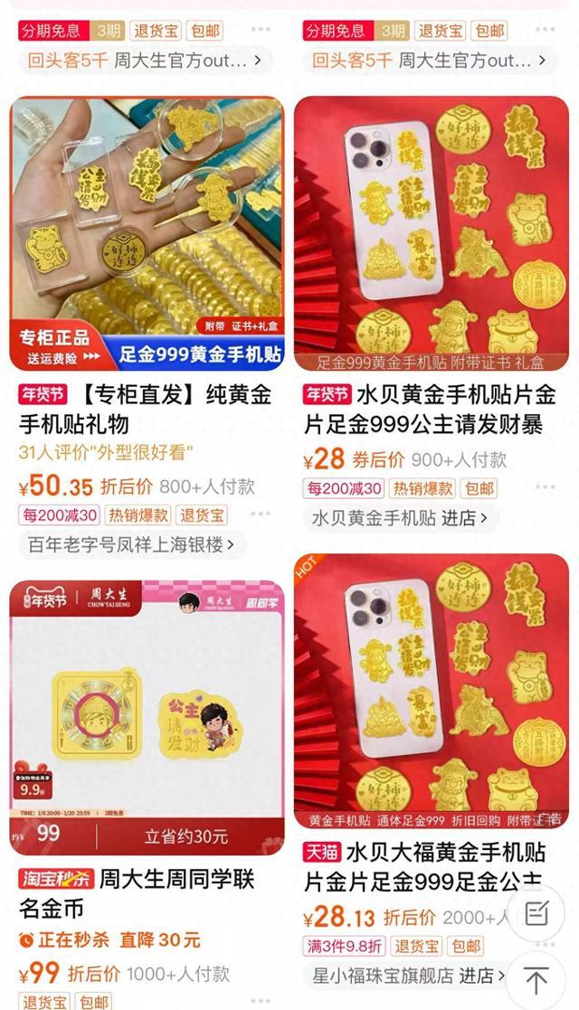 通过检索电商平台发现,黄金贴纸的项目各类且销售火爆,其中还不乏周大生、老凤祥等着名品牌店铺在售卖,价钱上从二三十元到一百多元不等。