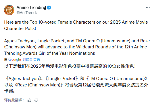 老牌动画投票网站 Anime Trending 近日公布了第 12 届年度动画电影变装票选成果,在“最好女性变装”前十名榜单中,《戏院版 跑马娘 Pretty Derby:新期间之门 》展现了惊东谈主的管辖力。其中,“爱丽速子”以 1,658 票的妙手气力压《电锯东谈主:蕾塞篇》的东谈主气变装“蕾塞”夺下冠军宝座。更令东谈主瞩策画是,前十名中竟有多达 6 位变装都出自《跑马娘》戏院版,包括第三名的“森林口袋 ”以及紧随自后四位都是,透彻洗版了这份年度榜单。