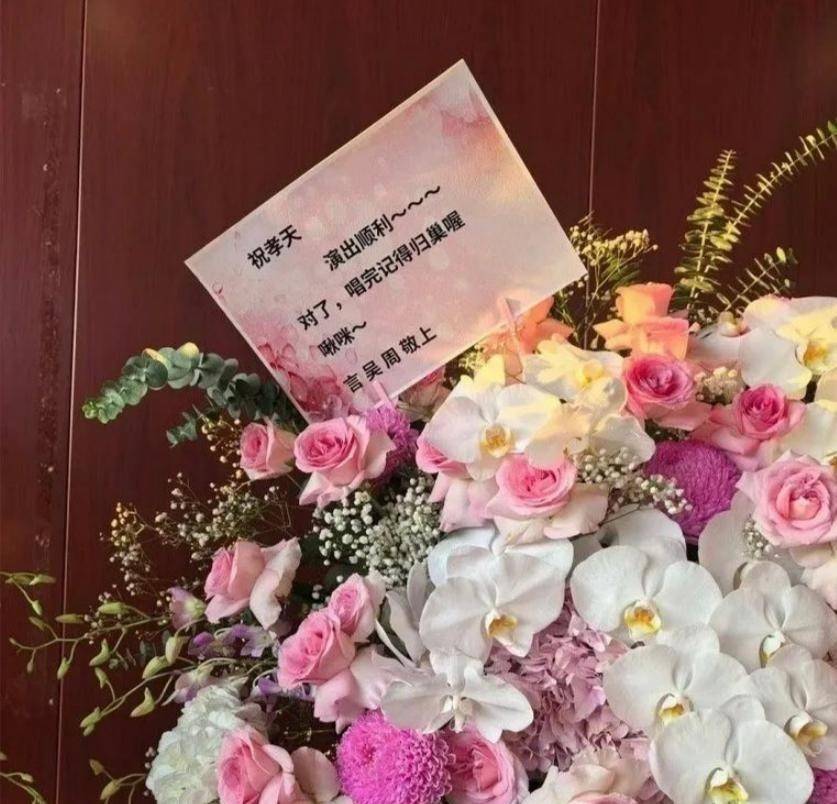 朱孝天举办个唱,他们三东谈主准时奉上花篮,卡片上写满祝颂话语。