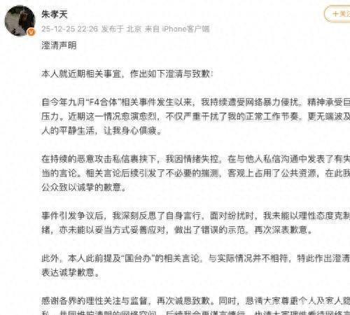 12月25日更阑,前F4成员朱孝天发布了一份“清爽声明”,把近期的争议恼恨于“神态失控”。