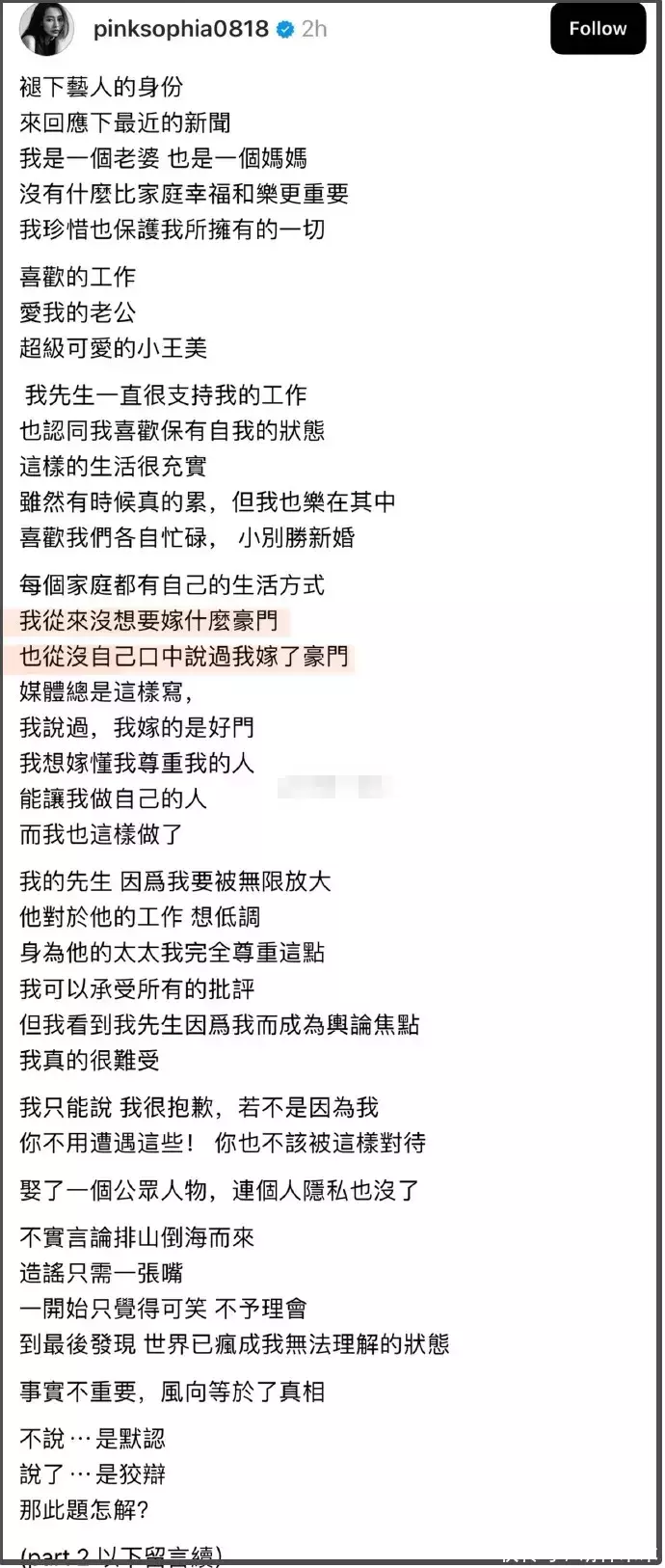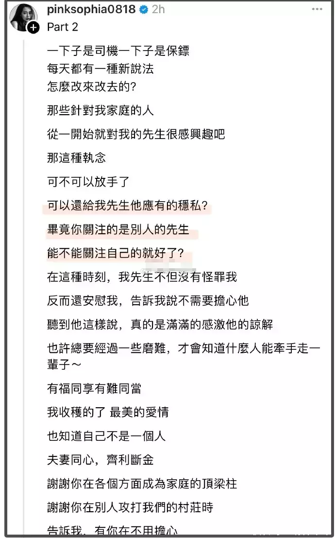 王念念佳连发两篇长文狂打厚谊牌,以“配头、姆妈”的身份博取愁然,感德丈夫对她使命的包容以及为此受到的隐讳骚动,否定切身说过嫁朱门,斥责齐是媒体假造。