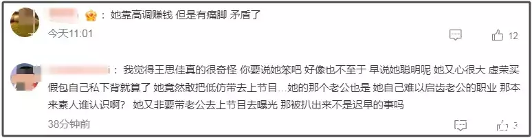 看到王念念佳两口子,有网友齰舌他俩是台版的“晚晚和大嘴”,齐虚荣心爆表,而用隐讳粉饰“丈夫办事”,用“嫁好门”类比朱门的说辞彰着胆小。同期,不少网友以为她不够智谋,既然丈夫办事难言之隐,为何高调带着上节目,那不等着被扒吗?