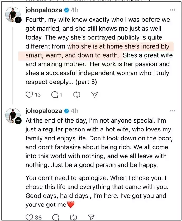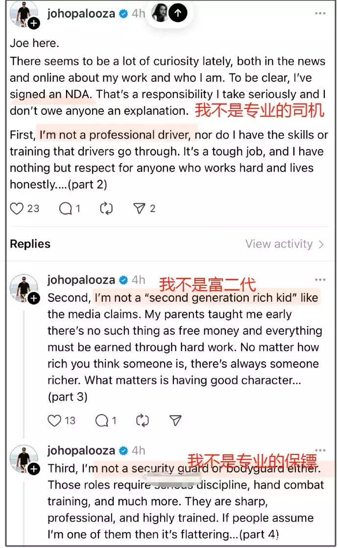 随后,王念念佳老公针对“司机身份”作念出了五点回复,其一他示意使命签署了守秘契约,不欠任何东谈主说明,不是专科司机,没受过联系培训,坦言是一份奋发的使命。其二不是富二代,父母从小老师莫得免费的午餐。其三不是专科保镖也不是保安,没受过工夫培训,若是认为是保镖太抬举。