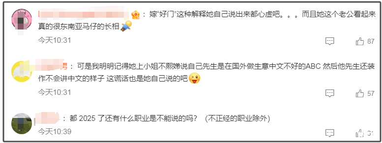 而丈夫身份是“司机”或“保镖”齐是外界的一张口,变来变去,责骂那些针对她家庭的报复,夸赞丈夫大度和缓,示意“佳偶齐心其利断金”。