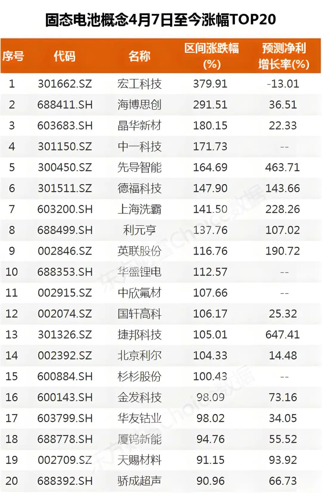 排行第一的是宏工科技,4月7日于今涨幅超370%,据高工锂电,宏工科技看成搀杂纤维化开导龙头,还是供货国内头部固态电板企业。