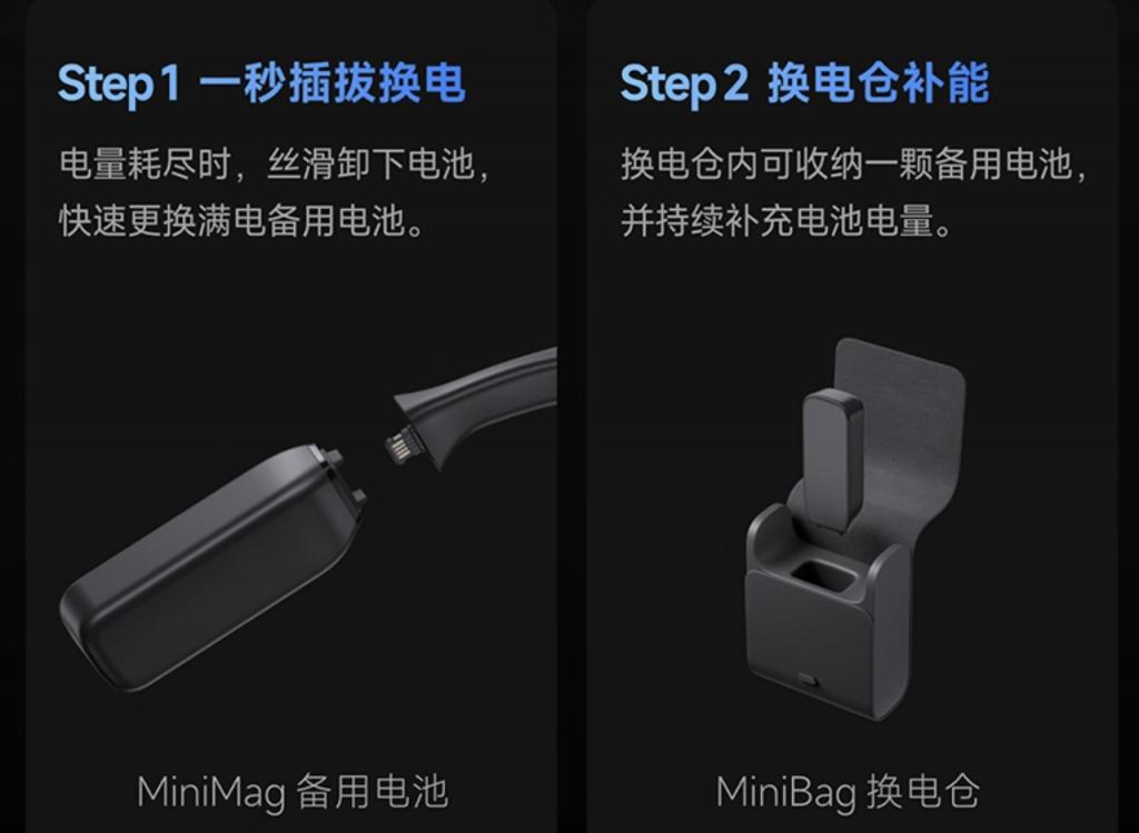 夸克 AI 眼镜将这一可拆卸的镜腿电板定名为 MiniMag 备用电板,其还领有一个配套的 MiniBag 换电仓。这一超小的 Mini 续航缠绵,比拟于眼镜仓其实更稳健不祥出行,支握全天候使用。