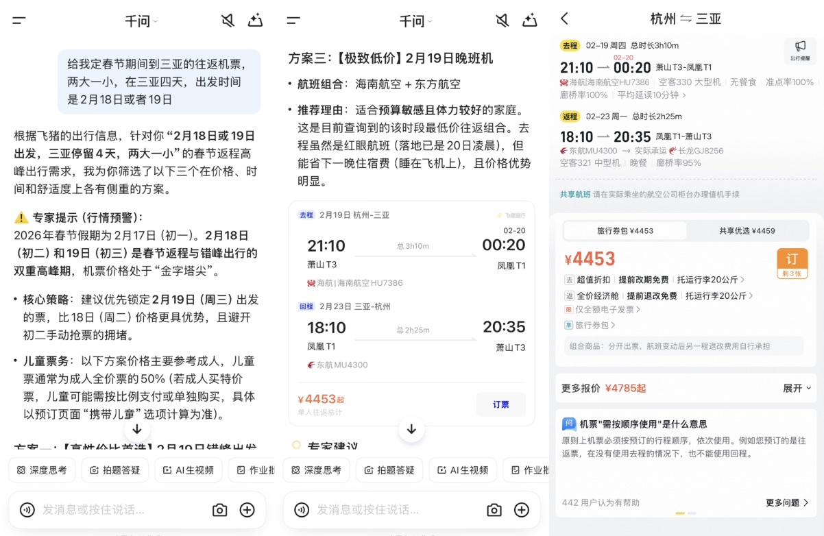 此外,千问App展现了强盛的跨应用协同能力。在春节出游场景中,千问App不错调用飞猪能力完成机票货仓的预定,不错调用高德的能力完成行程计较、年夜饭的预定。以致,千问App还能平直帮用户打电话订餐厅。