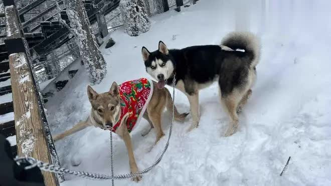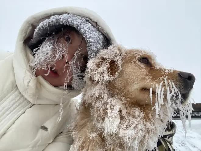 主东谈主满怀树立感和怜爱,在顶峰寒风中极重地抱起两只狗子准备合影迷恋。